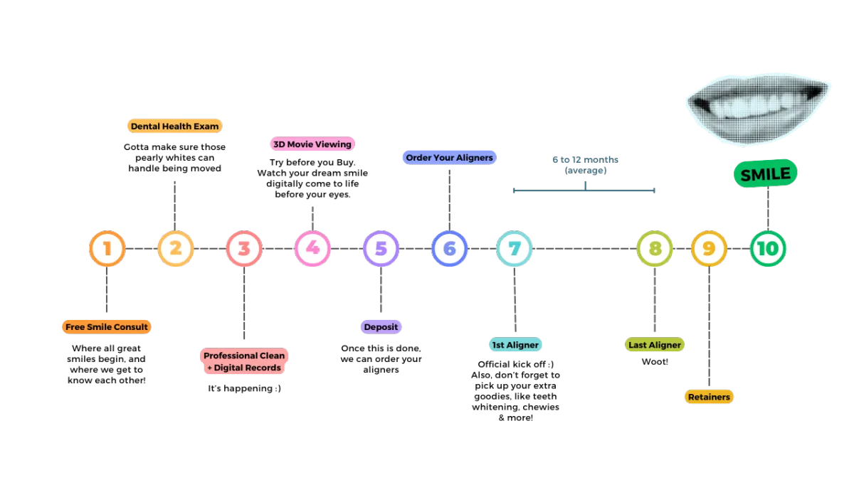 We have a full timeline right below this FAQ that shows your start to finish Invisalign journey and the processes you will be going through.